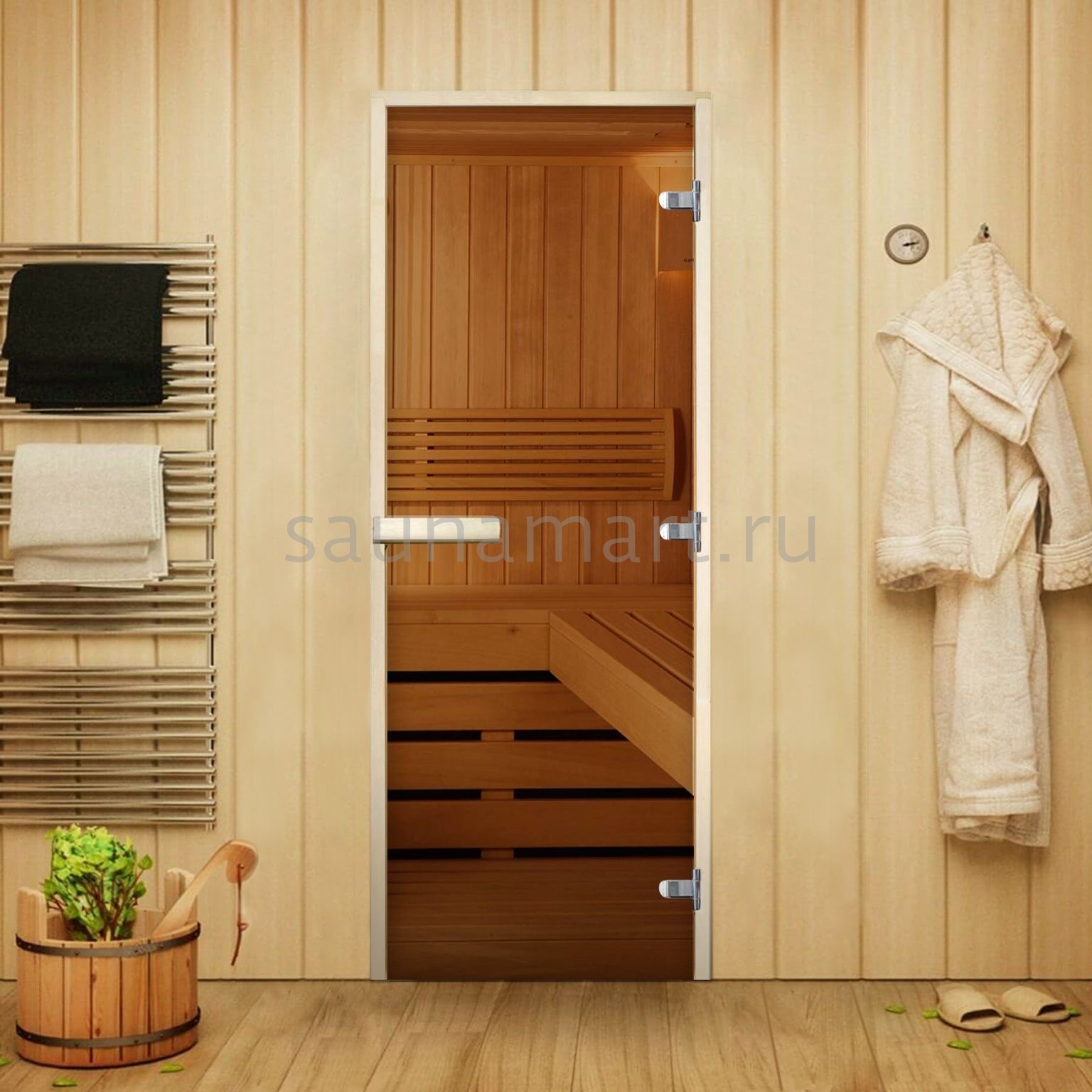 Дверь для сауны серии Элит сочетает в себе элегантный дизайн и высокое качество изготовления. Каркас из сосны толщиной 90 мм обеспечивает прочность и устойчивость к деформациям. Бронзовое закаленное стекло придает двери стильный внешний вид и создает мягкое освещение в парной. Универсальная система открывания и регулируемые петли обеспечивают удобство эксплуатации. Доступна в шести стандартных размерах для оптимального подбора под любую сауну. Комплектуется коробкой из лиственных пород древесины высшего сорта.