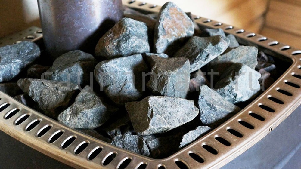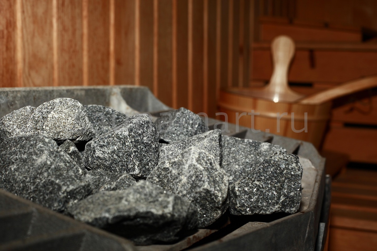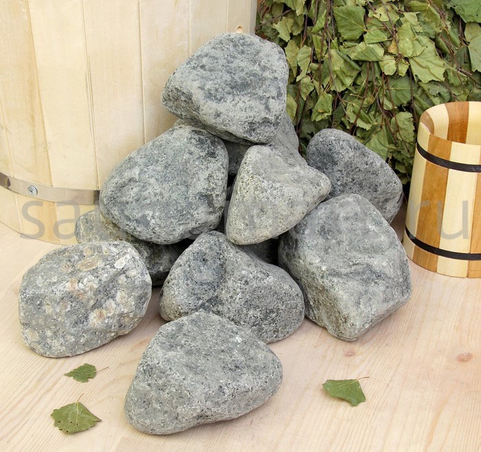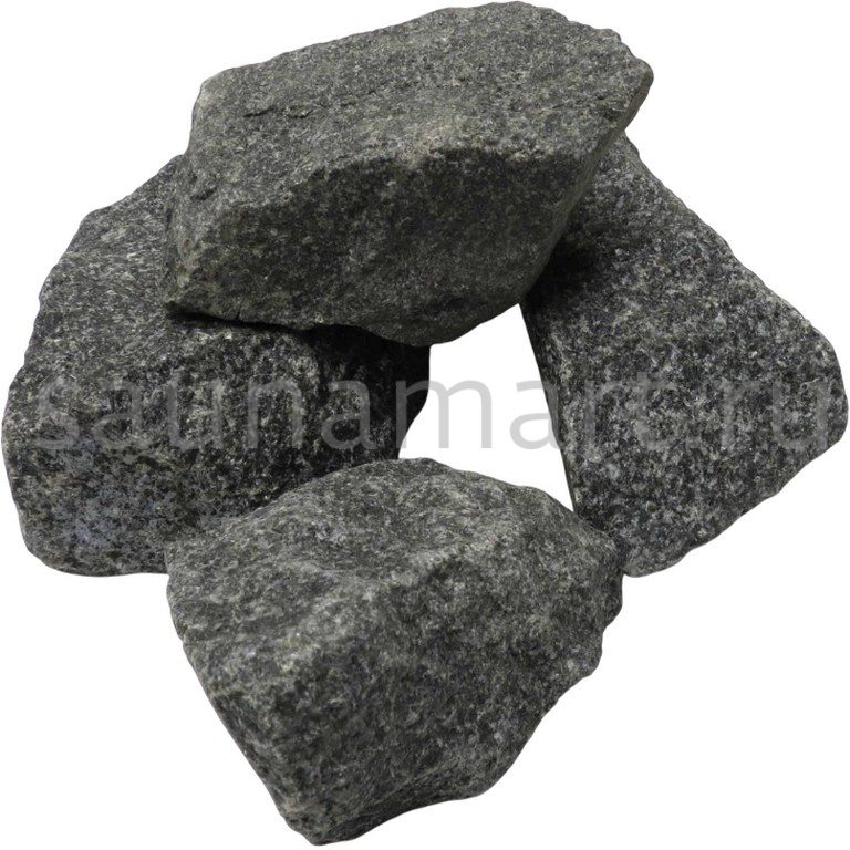 Камень габбро-диабаз колотый — надежный наполнитель для банных печей. Упаковка: мешок 20 кг.