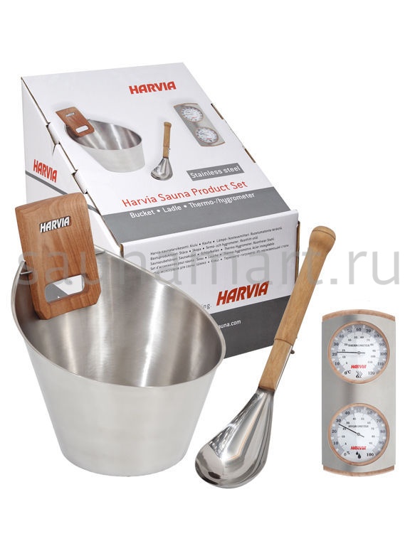 HARVIA Подарочный набор Дополните свою сауну стильными специальными аксессуарами. В комплект аксессуаров из нержавеющей стали входят: шайка, ковш, термометр-гигрометр. Материал: нержавеющая сталь Производитель: Финляндия