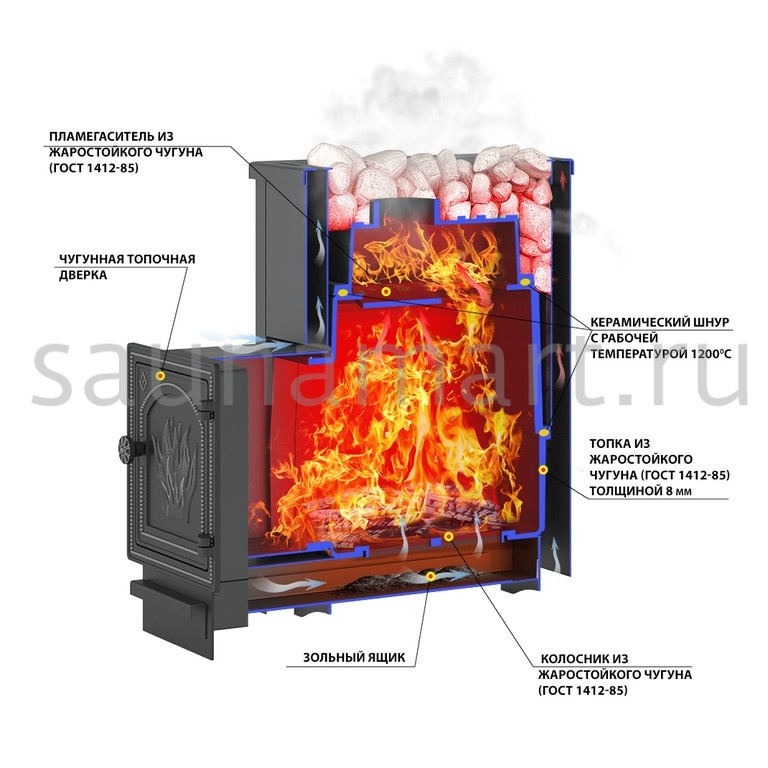 - Высокая теплоотдача: Обеспечивает быстрое и равномерное нагревание, создавая комфортные условия для парения.