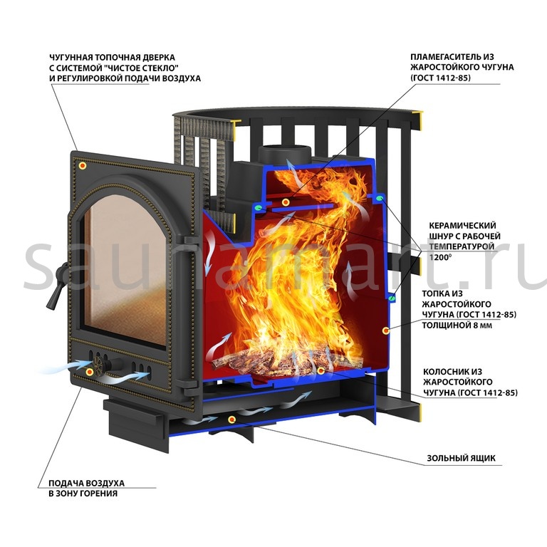Преимущество печи в том, что топка печи состоит из 3-х элементов. На стыке между ними используется керамический шнур с рабочей температурой 1200 градусов. То есть топка печи абсолютно герметична! Для фиксации деталей между собой применяется болтовое соединение, что даёт 100% гарантию безопасности при эксплуатации.