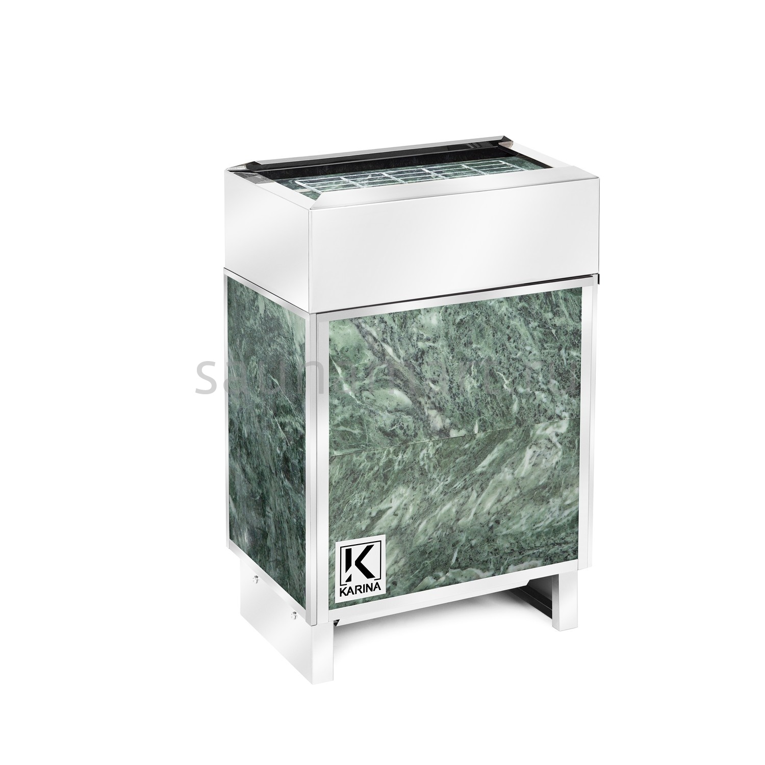 Электрическая печь KARINA Elite 6 Змеевик обладает оригинальным и современным дизайном. Благодаря своему стильному корпусу, она будет замечательно смотреться в интерьере любой бани. Мощность данной электрокаменки составляет 6 кВт, это позволяет ей прогревать помещение объемом до 7 куб. м.