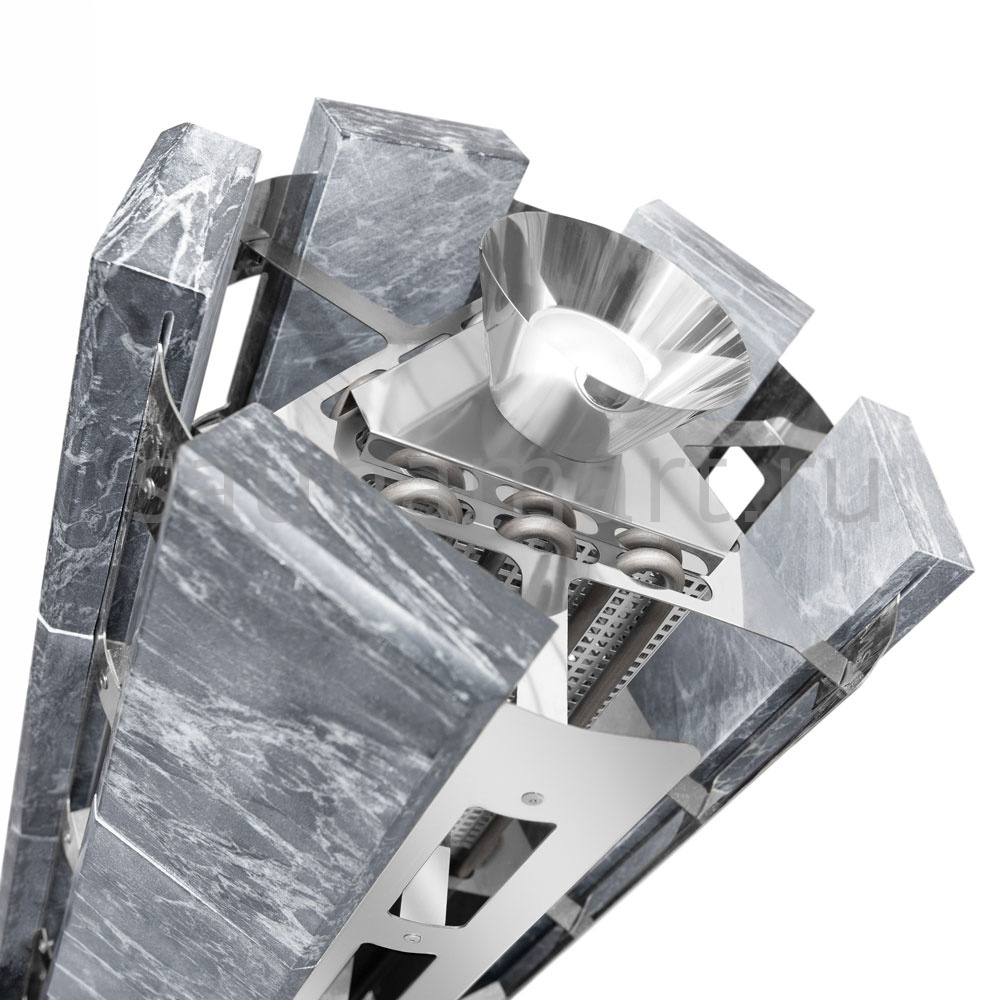 Все корпусные элементы печи выполнены из нержавеющей стали. Нагревательный элемент - ТЭН диаметром 10мм. Наружный кожух каменки дополнительно облицован плитами из Талькохлорита толщиной 40мм, что придает ей еще большую теплоемкость и меньшее излучение от металлических элементов, которые выжигают воздух в парной. Общий вес камней составляет 160кг (загрузка печи 100кг и вес облицовки 60кг). Вес камней сопоставим с закладкой в хорошую дровяную печь, тем самым с помощью парогенератора, закрытой каменки и закладки камня в 160 кг, легко достигается режим настоящей русской бани.