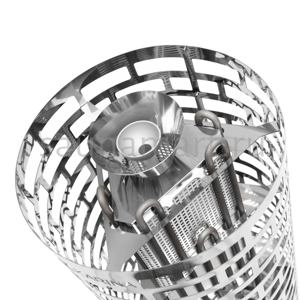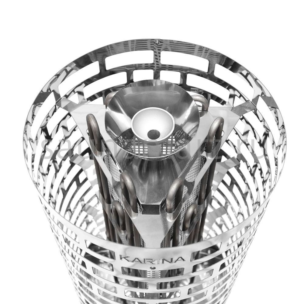 Электрокаменка Karina Nova 21E предназначена для использования в парных объемом до 38м3. Печь выполнена в напольном варианте, цилиндрической формы. Напряжение питания – 380В. Данная модель укомплектована 9 ТЭНами, расположенными в виде треугольника. Внизу каменки находится бак для воды емкостью 4.2 л, который является парогенератором. Выше парогенератора расположена емкость под мелкие камни или нержавеющие шары объемом 5 л, вмещающая 10 кг мелкого камня, называемая закрытой каменкой с воронкой для подачи воды и получения мелкодисперсного пара. Электрокаменка Karina Nova 21E многофункциональна, и при правильной эксплуатации она подойдет для любителей как финской сауны, так и русской бани.