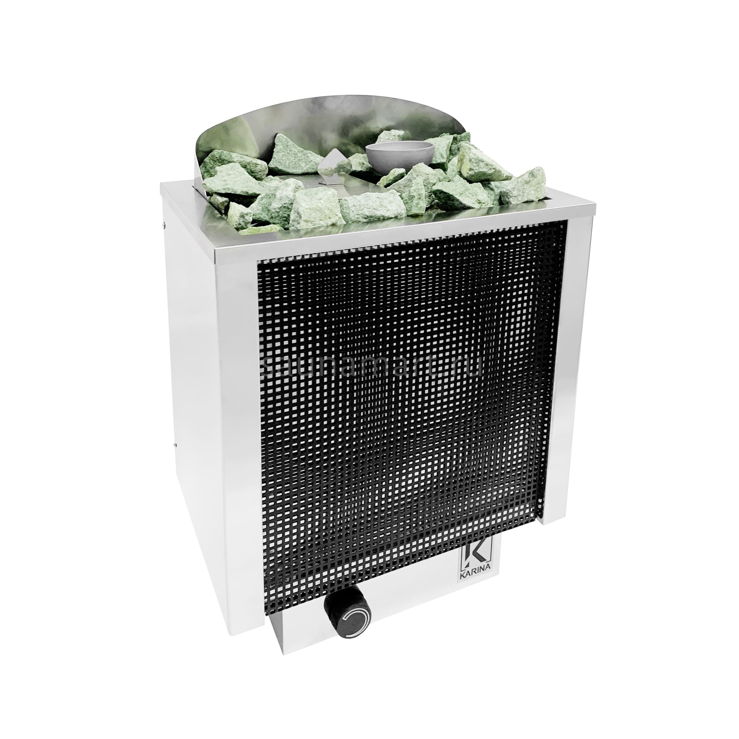 Электрокаменка Karina Optima Steam 6 предназначена для использования в парных объемом от 7 до 9 м3. Печь выполнена в настенном варианте со встроенным регулятором температуры. Напряжение питания печи 220/380В. Данная печь имеет 3 тэна, между которыми расположен бак для воды (который является парогенератором и одновременно фитозапарником для трав) и емкость в виде закрытой каменки с воронкой для получения мелкодисперсного пара. В закрытую каменку мы рекомендуем закладывать шары из нержавейки для более правильного эффекта. Обе емкости можно достать из печи для последующей очистки/мойки от налёта. Электрокаменка Karina Optima Steam многофункциональна, и при правильной эксплуатации она подойдет для любителей как финской сауны, так и русской бани. Если в парогенератор не заливать воду, парная разогреется до высокой температуры (100 -120 ?) с относительной влажностью воздуха 10-12% - режим сухой бани (финская сауна). Если залить воду в парогенератор, то при разогреве парной вода будет испаряться и увлажнять воздух в парной до режима русской бани (60-70 ? и 35-45% влажности).