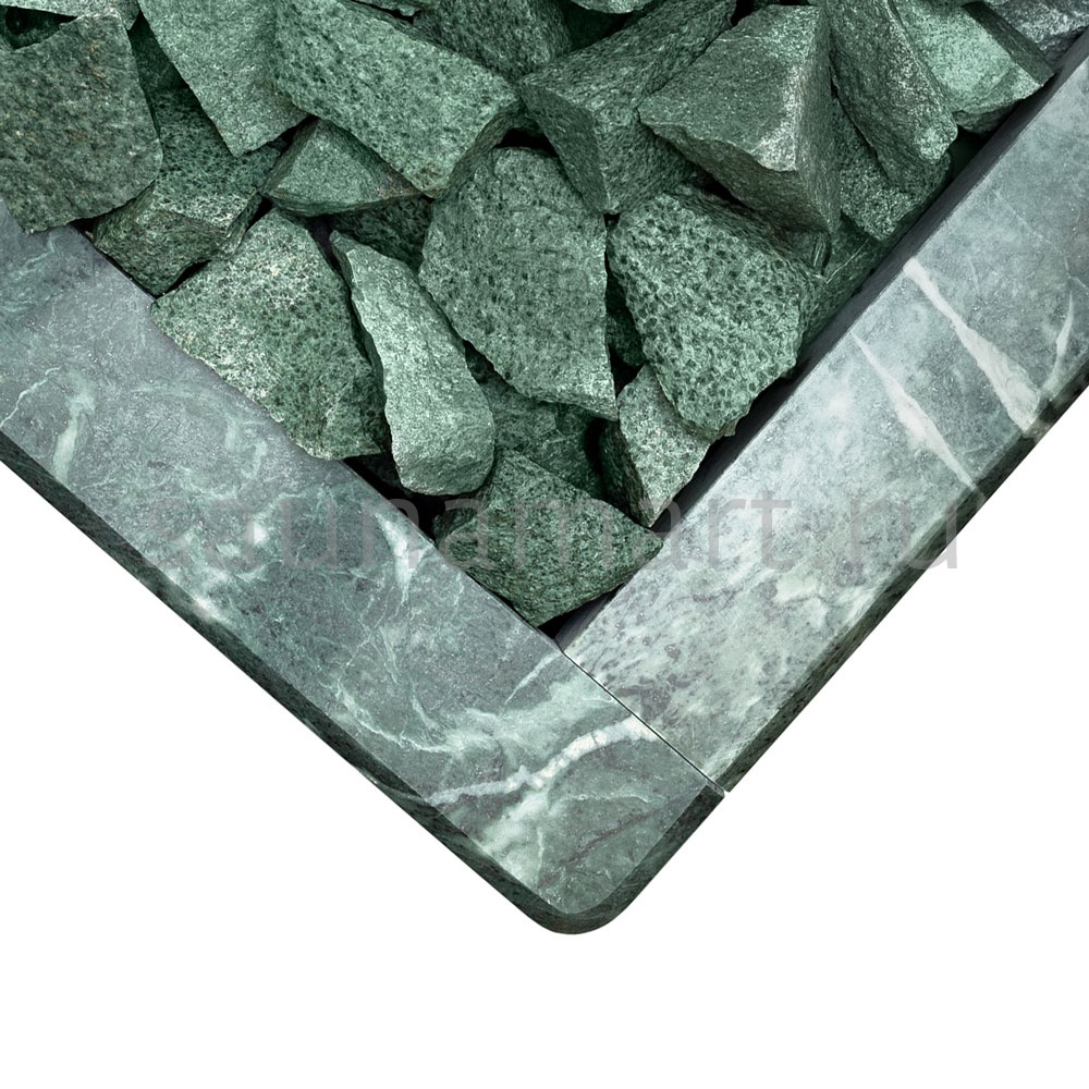 Электрическая каменка со всех сторон облицована натуральным змеевиком. Печь с подобным дизайном стильно смотрится в парильном помещении. Змеевик уже долгие годы используется для внутренней отделки бань. Его называют «аптекарским камнем» за его целебные качества. Минерал оказывает обеззараживающий эффект, положительно влияет на кости, оказывает успокаивающее воздействие и укрепляет иммунитет.