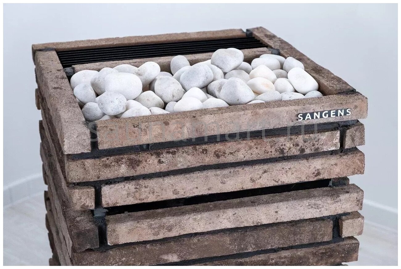 Электрическая банная печь Sangens W12B — 6-киловаттная модель из серии W для помещений 9-10 м? (9 м? для сауны, 10 м? для бани). Оснащена комбинированной каменкой (закрытый отсек: 25-45 кг камней, открытый: 15 кг) с нагревом до 530°C за 2.5 часа, прогревает парную до 70°C за 1.5 часа. Управление — дистанционное и ручное. Облицовка — ригельный кирпич (коричневый, 110 кг), общий вес — 165 кг. Габариты: 54?54?95.5 см. Камни приобретаются отдельно.
