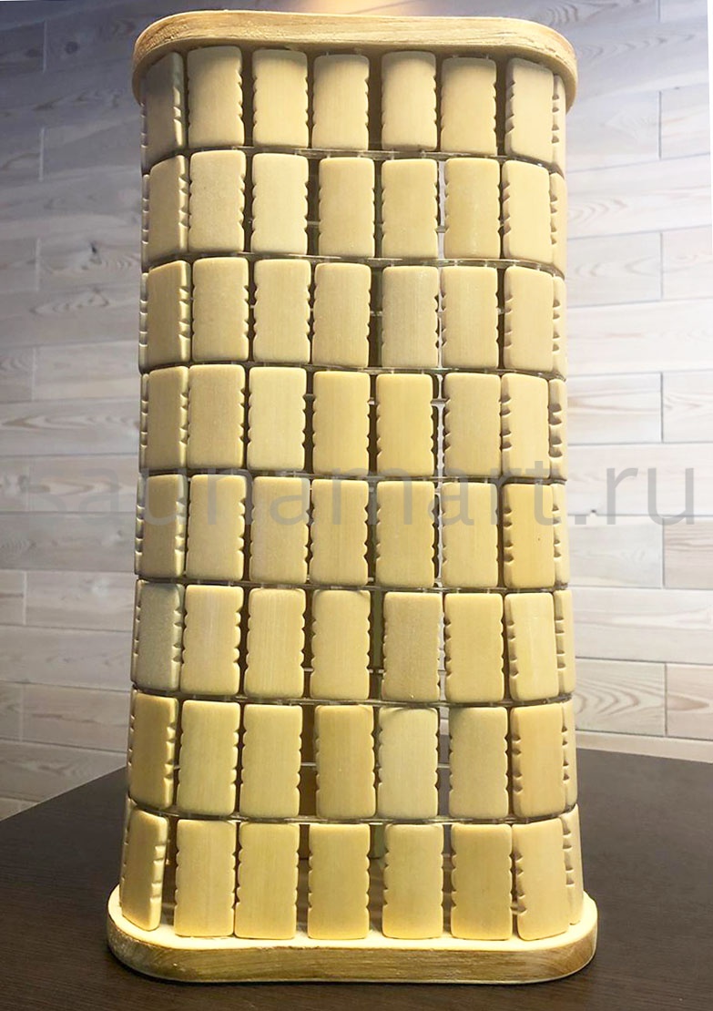 Подголовник выполнен из бамбука, материала, который отличается экологической чистотой, высокой устойчивостью к механическим воздействиям и упругостью. Подголовник позволяет с удобством расположиться на полке во время банных процедур и полностью расслабить тело. При использовании подголовника шея оказывается полностью расслаблена и не испытывает напряжения, а голова приподнята, что предотвращает прилив крови к голове, крайне нежелательный в условиях высокой температуры. Подголовник украшен геометрическим орнаментом из светлых и темных участков, которые чередуются между собой.