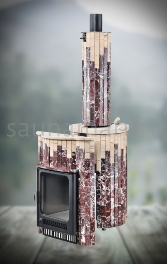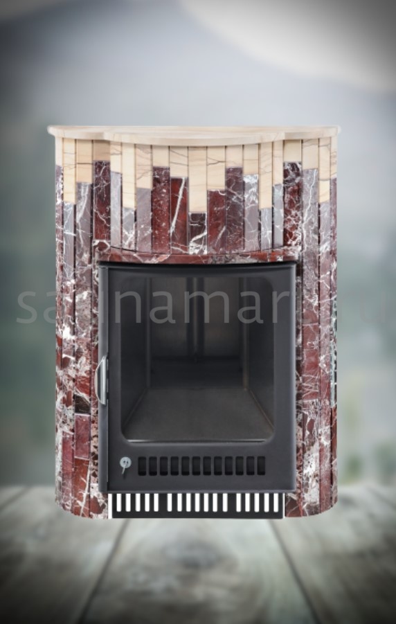 Для печи «Оптима» серии ПФ производитель V?hringer выпускает порталы из натурального мрамора, змеевика и жадеита. Облицовочные материалы поступают на завод в слэбах, заготовки разрезают на пластины, которые затем навешивают на печь.