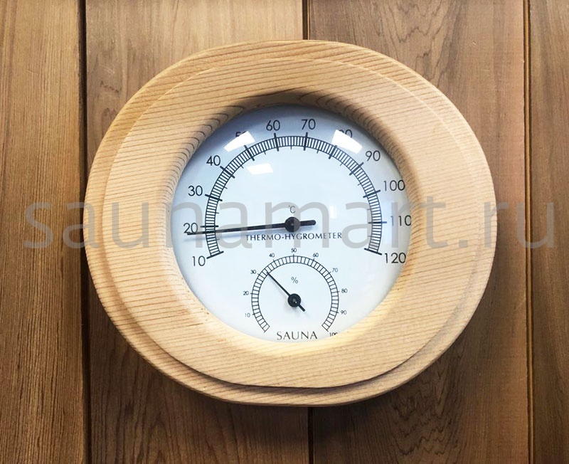 Термогигрометр имеет оригинальную круглую форму. В широкой рамке из древесины кедра находится циферблат, который сообщит о температуре воздуха. Данный прибор прекрасно подойдёт для использования в парной. Максимально допустимая для измерения температура составляет 120 градусов Цельсия. Этого максимума достаточно для комфортных банных процедур. Нагнетание в парном помещении большей температуры нежелательно, так как может быть опасным для здоровья. Благодаря универсальному дизайну термометр станет прекрасным дополнением любого интерьера.