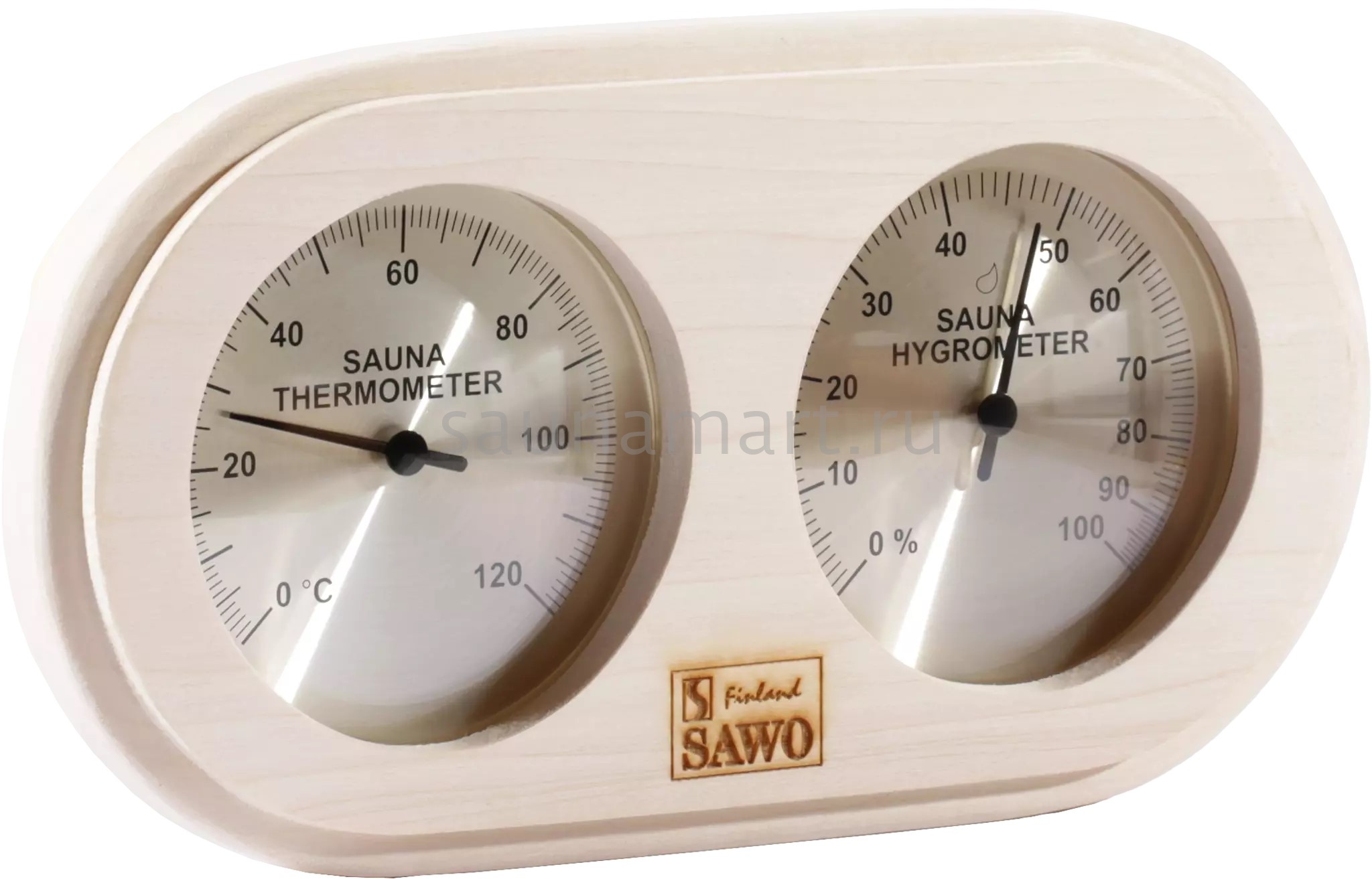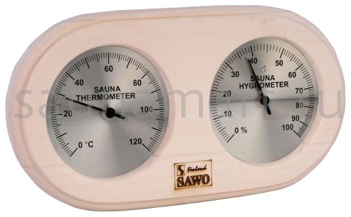 Термометр-гигрометр Sawo для саун сочетает в себе две полезные функции – измерение температуры и влажности воздуха. Вас непременно порадует качество и внешний вид прибора. Лучшим местом для установки прибора является наиболее удалённая стена относительно входа и печи. Укреплять его следует на высоте 1,5м от пола.