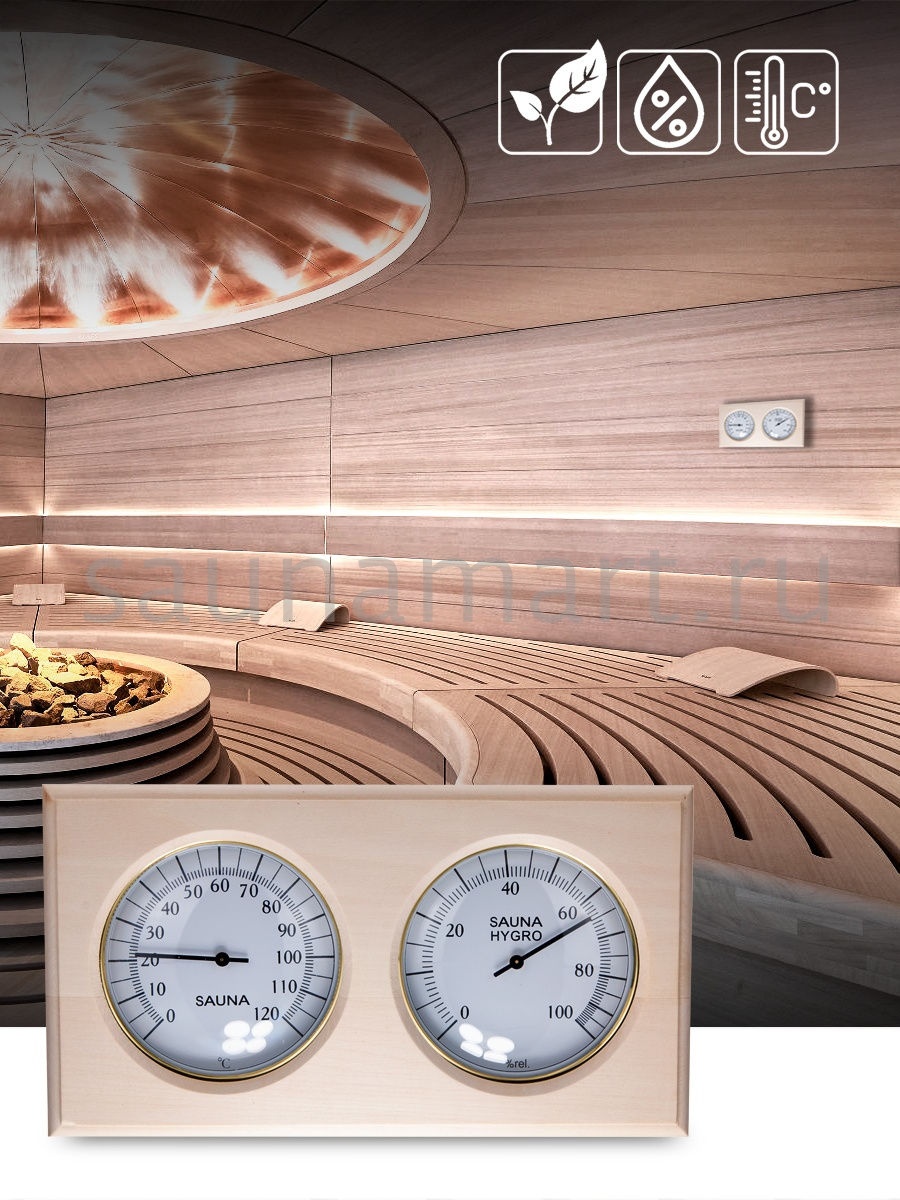 Термогигрометр это комбинированный прибор для измерения температуры и влажности в парной. В лаконичной, прямоугольной, широкой рамке из термо древесины липы находятся два больших, круглых циферблата. Один циферблат - это гигрометр, который с точностью измерит уровень влажности в парной, другой циферблат - термометр, который сообщит о температуре воздуха. Данный прибор прекрасно подойдёт для использования в парной. Благодаря универсальному дизайну он станет прекрасным дополнением любого интерьера. Наш термогигрометр для бани и сауны соответствует всем требованиям для данных приборов - оснащен не сильно нагревающимся корпусом и способен выдерживать перепады температуры и влажности. Размер термогигрометра 24,7х13,6х3,4 см.